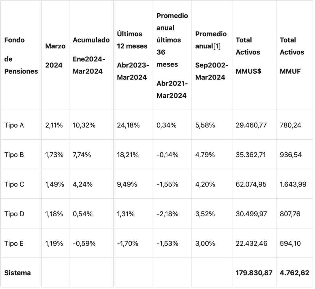 Marzo de 2024 ha cerrado con buenas noticias para el sistema de pensiones chileno. Todos los fondos han registrado ganancias, evidenciando la fortaleza y resiliencia del sector previsional ante el panorama económico actual.
